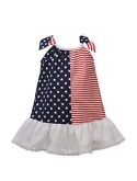 Dress features trapeze style with navy blue cotton with white stars on one side and red and white stripes on the other side. Bottom has white flounce with eyelet trim. Strap shoulders have adorable bows on either side. Sizes 12m-24m come with matching diaper cover panty . This dress is absolutely adorable!