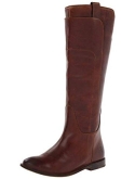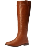 Knee-length riding boot with layered shaft featuring twin pull handles and low stacked heel