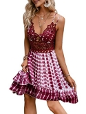 Features: Spaghetti straps, sexy deep v neck with lace embroidered-design, backless, a-line style, above knee length, ruffles hem, puffy skirt, not see through with liner inside, boho fashion beach dress, skater swing dress. Make you more beautiful, fashion, sexy and attractive.
