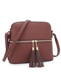 MATERIALS: Pebbled vegan leather (PU) exterior with gold-tone hardware. Interior fully-lined. Matching faux leather shoulder strap and tassels.