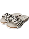 Thick firm mid-sole of slides for women is cork for comfort and shock absorption.