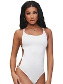 Fabric is soft and stretchy Sleeveless, Backless, Scoop Neck, Strappy Thong Bodysuit Tops Model Measurement: Height: 173cm/5'8", Bust: 81cm/32", Waist: 58cm/23", Hip: 91cm/36", Wear: S.