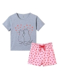 Cute Pajama Short Sets for Women: short sleeve top with round-neck. Shorts with elastic waist and drawstring. Adorable prints: coffee, books, sleep mask, pillows, etc.