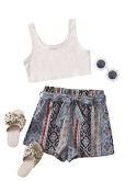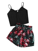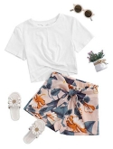 Design: Twist front crop tshirt & Tropical print, tie knot waist shorts