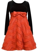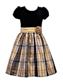 Dress has short sleeves with a black stretch velvet bodice. Skirt is made with black white and gold tartan plaid. Pretty gold organza bow around waist. Back has zipper closure for easy dressing. Comes with a matching diaper cover panty.