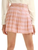 DETAILSA woven mini skirt featuring an allover plaid pattern, high waisted, knife pleats, A-line silhouette, fake pockets,button decoration and concealed side