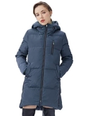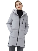 Design mid-long down jacket features with adjustable drawstring hood, interior waist drawstring, 2 big side pockets, 1 decorated zipper pocket.