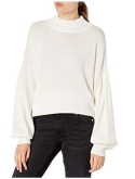 Mock neck pullover sweater with puffed blouson sleeves featuring dropped shoulder seams and pleated detailing. Ribbed collar, hem, and cuffs.