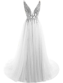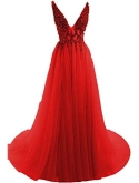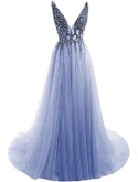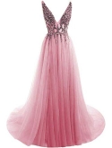 Women's V Neck Beaded Prom Dresses Long Slit Evening Party Gowns