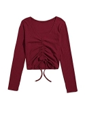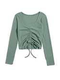 Ribbed knit crop tee features long sleeve, v neck, drawstring ruched front and tie knot detail