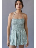 A sweet romper from UO. Straight-across neckline. Flowy shorts. Finished with an adjustable tie at the nape of the neck and a smocked bodice.