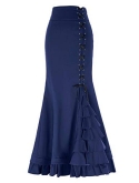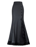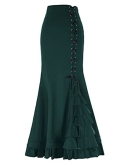 Corset style lace-up design in the left of front; mermaid hemline with ruffled details; Mermaid silhouette with a slightly high waist featuring asymmetrical detailing; Perfect match with victorian blouse https://www.amazon.com/dp/B074C8PHS1