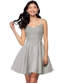 FEATURES:A line,above knee length,cutout two big pockets,v neckline,sleeveless,spaghetti straps,lace applique bodice,natural waistline,adjustable lace up back,fully lined,built-in bra
