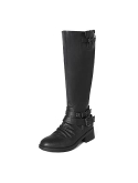 Moto-inspired riding boot with buckled straps at ankle and curved antiqued zipper, and instep zipper for easy on/off