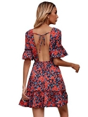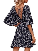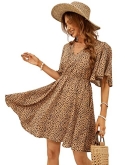 Boho ditsy floral print, plunging neck, deep v neck, short sleeve, self tie front, knot pront, elastic waist, a line, short dress