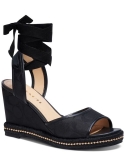 Wrapping ankle ties add leg-lengthening lines to a signature wedge lift in the Page sandals by COACH.