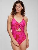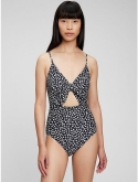 This swimsuit is made with 85% recycled nylon. Less waste in the world. More great swimsuits for you. Soft stretch knit swimsuit. Tie-front v-neckline. Spaghetti straps. Cutout at front. #801175