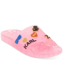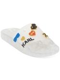 Round-toe slip-on slide sandals Graphic embellishments at upper Rubber upper; rubber lining; rubber sole Imported Karl Lagerfeld Paris brings signature style to a classic pool slide design with fun colors and graphics on the Thea sanadals.