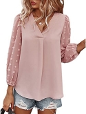 FEATURES - V neck, long sleeve, lantern semi-sheer sleeves with elastic cuffs, hemline curved, swiss dot details on sleeves, cute pom poms tops, chiffon blouses.