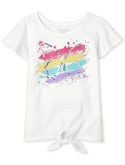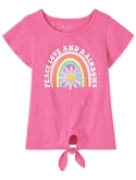 DESIGN — Features short ruffle sleeves, tie front hem and 'Peace, Love And Rainbows' graphic design at front