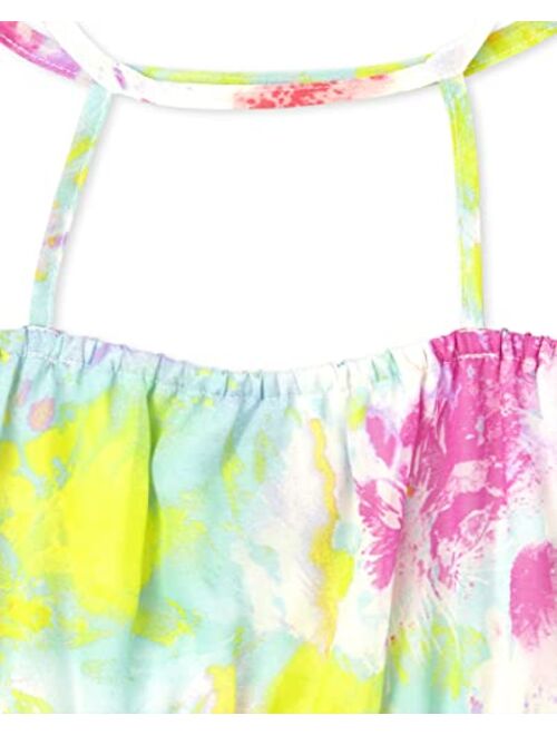 DESIGN — Features allover rainbow tie dye print, hanky hem, cutouts at back and above-the-knee length