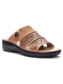 Slide sandal with laser-cut detailing and medallion embellishment. Extra-cushioned, removable polyurethane insole with microfiber sock lining. Lightweight cushioning polyurethane with rubber inserts for traction.