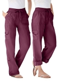 These versatile and lightweightcargo utility pants with straight legs can be worn long or rolled into a capri it's like getting two pants for the price of one. Button tabs at the hem secure the rolled hem, and small cargo pockets on the sides along with back patch pockets and topstitched slant pockets add to the utility feel. An elastic waistband with adjustable drawstring ensures the perfect fit that you can move in comfortably all day.