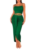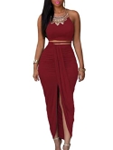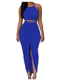 Design: sleeveless, spaghetti straps, high waist, front high split, ankle length, slim fitting, solid, vintage 2 piece maxi skirt sets long dress. Sexy high split shows long legs, form fitting and flattering dress.