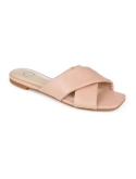 Crisscross strap upper Soft faux leather material Comfortable padded footbed Faux leather upper Polyurethane lining Manmade outsole