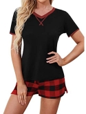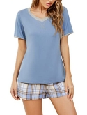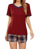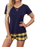 【DESIGN】: top and bottom sleepwear set, V-neck short sleeve tee shirt top with stretchy elastic waistband shorts, cuff contrast color.Cute and classic plaid pattern design is suitable for every age group. Simple pullover styling for easy fit. Nice design short pajama set for a relaxing day or night.