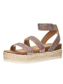 Featuring a lightly padded man-made lining and footbed, faux cork and jute wedge heel, and a man-made outsole.