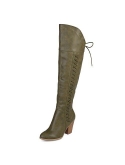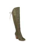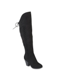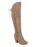 These trend-setting wide calf knee boots by Journee Collection are made with premium faux leather ( polyurethane, polyester ) uppers, with a raised vamp that covers the knee, and lace detail on the side and back. Faux woodgrain outsoles and block heels provide style to complete the design.