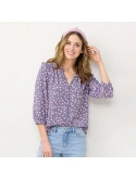 Ruffle details Button front Puff 3/4-length sleeves with elastic cuffs Seersucker construction Rayon, polyester; Rayon, cotton Machine wash Imported NA