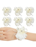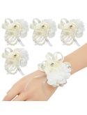 Material: All wrist corsages are made of 1 beige artificial silk rose, 2 white artificial foam rose-bud, silver bow ribbon, artificial rhinestone. The exquisite and vintage hand flower may stand out in the wedding prom.