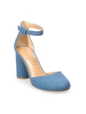 Faux-suede upper for a chic look Adjustable ankle strap for a secure fit Fabric upper & lining Memory foam midsole Polyurethane insole Round toe Buckle closure Padded footbed 3.3-in. heel