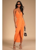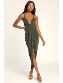 Lulus Exclusive! Show up fashionably late in the Lulus Dreamy Date Champagne Surplice Midi Dress! Textured stretch knit, with a bit of sheen, shapes this must-have dress that falls from adjustable straps (that crisscross in back) into a surplice neckline and a lightly gathered bodice. A fitted waist tops a draping midi skirt that creates a stunning silhouette before ending at a tulip hem.