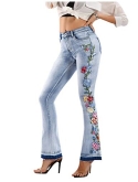 Mid waisted flare jeans,flower embroidery and light white wash style,classic 5-pocket design:front scoop pockets,back patch pockets with belt Loops.