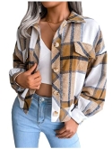 Lapel collar, drop shoulder, buttons cuff, solid color cropped cute shirts jackets coat outwear for women girls casual with two flap chest pockets