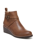 Faux leather upper with a round toe, side zip, back pull tab, crisscrossing strap detail with metallic buckle, lightweight wedge heel, and treaded sole