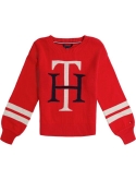 A slouchy silhouette defines cozy in this jersey sweater by Tommy Hilfiger, featuring stripes at the cuffs and lurex intarsia monogram in signature style.