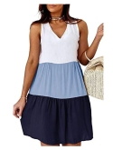 Feature: V neck, sleeveless, color block, women sundress, casual style, summer mini dress, above knee length.