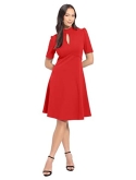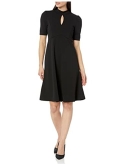 Mock neck with center front keyhole opening, just above the elbow sleeves with shirring at shoulder, princess seams, upwards V shaped empire seam, and a knee length fit and flare skirt.