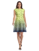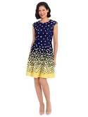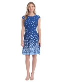 Jewel neck, cap sleeves, ombre dots print, and solid hem band on above the knee skirt.