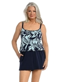 DESIGNER SUMMER SWIMWEAR A bevvy of tropical blooms in brilliant hues pops against a black background on our plus-size swim romper. The gathered waist defines the midsection while still offering a comfortable loose fit.