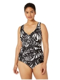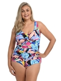 DESIGNER SUMMER SWIMWEAR Palm fronds in vibrant hues that pop against a black background on this plus-size one-piece suit will instantly put you in vacation mode. control neatly conceals worry areas.