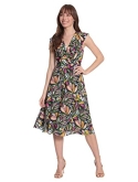 V-neck with ruffle frame, sleeveless, neck and waistbands, and below the knee full skirt.