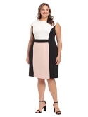 Jewel neck, extended cap sleeves, contrast colors at front and back bodice versus side panels and waistband versus front and back skirt panels, princess seams, and an above the knee length skirt.