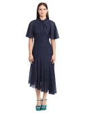 Model is 5'11" tall, with a 30" bust, 24" waist, and 35" hip measurement, wearing a size 8 - dress length from center back neck to hem is 38 1/4".