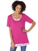 Layered-look tunic with a print inset at the scoop neck to add pattern and color. Relaxed fit. Curved high-low hem.