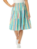 This tiered skirt is made in a jersey knit that's super easy and super comfortable. A full elastic pull-on waist offers all-day comfort and also creates a perfect fit.